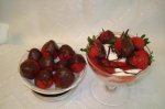 Pepenele il taiem in doua,scoatem semintele,scurgem de zeama,umplem cu capsuni taiate si apoi ornam cu frisca,ciocolata si sirop de capsuni.