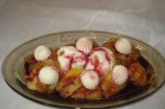 Taiem banana in bucatele.Intr-o tigaie punem untul sa se topeasca,adaugam bucatile de banana si zaharul brun si lasam sa se caramelizeze.Asezam ingetata pe farfurie,apoi bananele si miezul de lapte si stropim din belsug cu siropul de cirese amare.Se serveste pe repede inainte.......