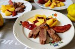 Piept de rata cu gutui caramelizate in miere si gem de afine