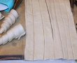Foietajul se laasă la dezghețat lent, în frigider. Apoi se întinde pe masa de lucru și se taie fâșii de cca. 1 cm lățime, pe toată lungimea foii.