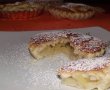 Aluatul il intindem si decupam cercuri de marimea formelor de tarta. Eu am folosit forme de tarta mici diametrul 6. Ungem formele cu unt si dam cu faina. Asezam aluatul in forma .Peste aluat adaugam mere, iar peste mere ori punem o alta foaie de aluat ori facem fasii din aluat cu care decoram tartele. Continuam pana terminam aluatul si merele. Le ungem cu galbenusul. Tartele se introduc la cuptor la 180° cam 30 minute. Cand sunt rumenite se scot si se orneaza cu zahar pudra.