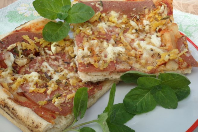Coca se lasa la dospit pana cand isi mareste volumul, apoi se intinde o foaie de aproximativ jumatate de cm grosime.Aluatul se pune in tava unsa cu putin ulei, peste aluat se pune: bulionul de rosii, felii de parizer, ouale date pe razatoarea mare, ceapa si ceapa verde taiate marunt, branza data tot pe razatoarea mare si la sfarsit oregano.