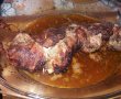 Punem rulada in vasul de yena, stropim cu vin si cu ulei, presaram ardei boia, sare si piper dupa gust si dam la cuptor pentru 60-70 de minute.