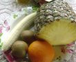 Curăţăm fructele şi le tăiem:ananasul şi portocala se taie cubuleţe iar banana şi kiwi se taie rondele, apoi le punem într-un bol şi turnăm mierea de albine peste ele.