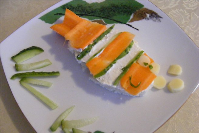 Decupam din felia de paine forma de peste.Decoram apoi ca in imagine,pornim de la gura cu o felie de morcov,delimitam cu coaja de castravete,la 1cm distanta mai punem o fasie de coaja de castravete apoi continuam cu morcov.Coada am facut o decupand intr-un morcov.Ochisorii si bulele sunt din cascaval iar sub peste niste alge din castravete..